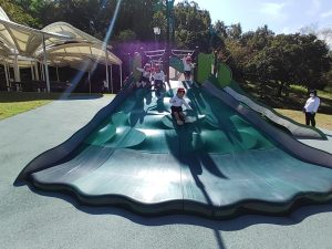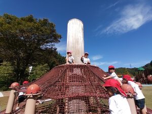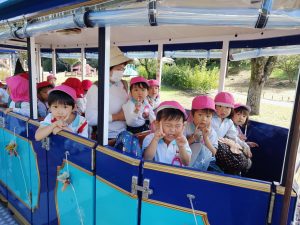 ポッポから降りてからは遊具で遊びました。遊具の上から「おーい!!」と友達を呼んだり何度も滑り台を滑ったり、とても楽しく遊ぶことができました。
