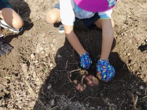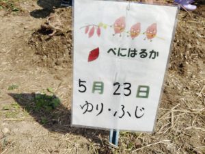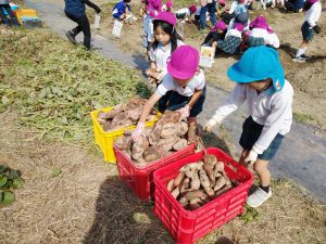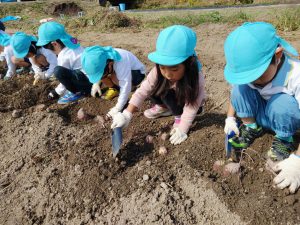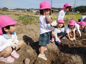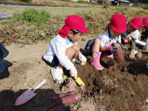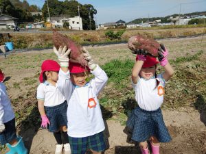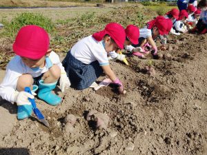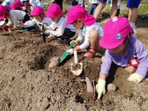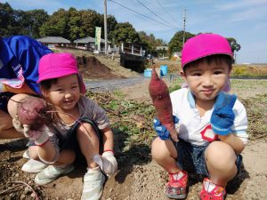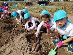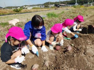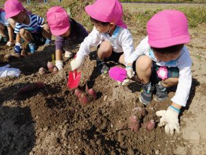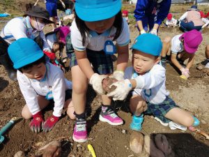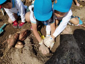 年中さんも紅はるかを収穫しました。さぁ、たくさん掘れるかな?