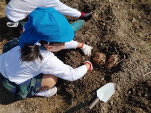 年長さんは、安納芋を掘りました。スコップや手を使って、さつま芋の周りの土をかき分けます。