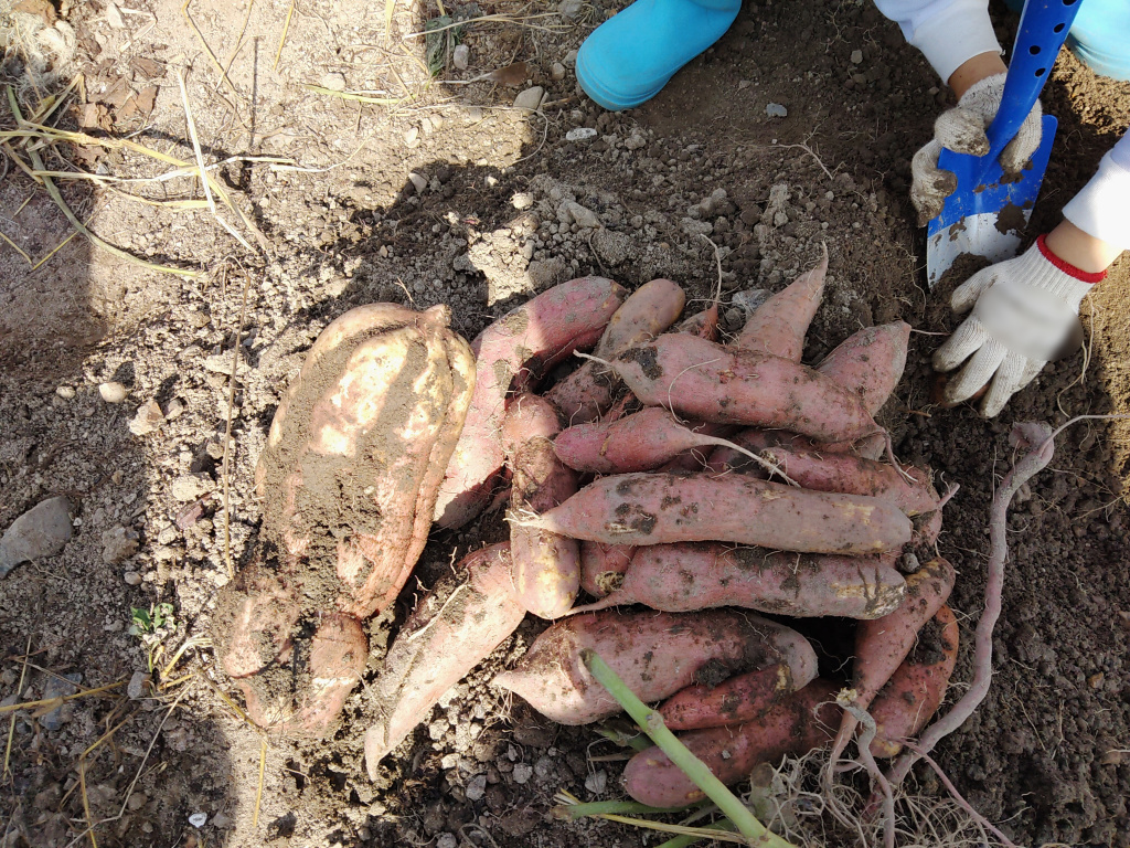 大きなお芋がたくさん顔を出しています。「なかなかとれない」と諦めかけるとお姉さんが「手伝ってあげるよ。頑張ろう」と励ましてくれましたよ。