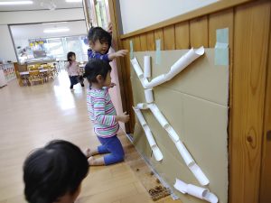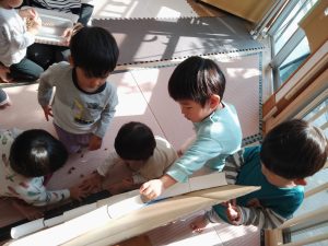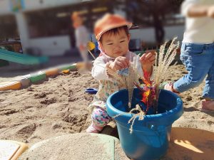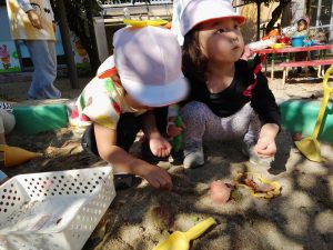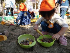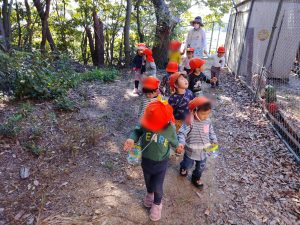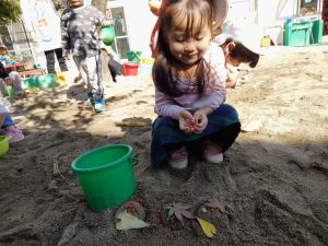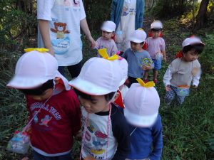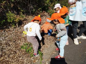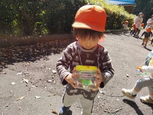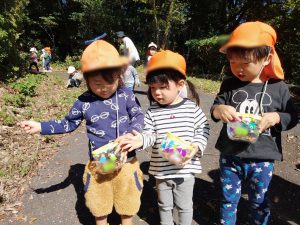 いつの間にか、季節はすっかり秋模様となりました。9月に作ったお散歩バックを持ってお散歩に出かけましたよ。 「1.2.1.2」とお友達と手を繋いで、歩いていますよ。初めての道でワクワクが止まりません! どんぐりの木の下に到着!「どんぐりがいっぱい!!」「赤ちゃんどんぐり小さくてかわいいね」「帽子被っているどんぐりあったよ!」と色々などんぐりを集めることができました。 どんぐりがお散歩バッグにいっぱい集まってきました。木の枝を持って演奏隊に変身! 「トントントン」とお散歩バッグを叩いてどんぐりのいい音が鳴っていましたよ!!♬ 拾ってきたどんぐりをコロコロ〜と転がして遊びました。 「どんぐりコロコロ♪」と話しながら転がしたり順番を守ったりし友だちと仲良く楽しめましたよ。   この日は、園庭で秋の自然物を使ったパーティをしました! 落ち葉や紅葉を分けたり、生花のようにススキを立てたりしていますね。「先生今作ってるから待っててね!」とお話してくれました。どんな料理ができるのかな?とてもワクワクしました! 「ねねー!ここにトッピングしてもいいかな?」「いいよ!」と友達同士で相談しながら作る姿もたくさん見られましたよ。   とてもかわいいケーキができたね!「ケーキ先生食べていいよ!」とお裾分けしてくれました。     園外に散歩することで秋やいつもと違う雰囲気を感じられたりたくさん歩き、とてもいい運動になりました。まだまだイチョウや紅葉がきれいになってくる時期なのでこれからも戸外で自然に触れてたくさん遊んでいきたいと思います。