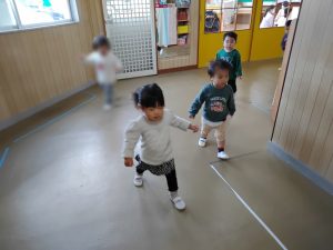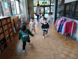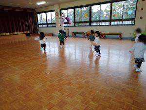 最後は、走って保育士と追いかけっこ。広〜いホールでのびのびとしている子どもたち。