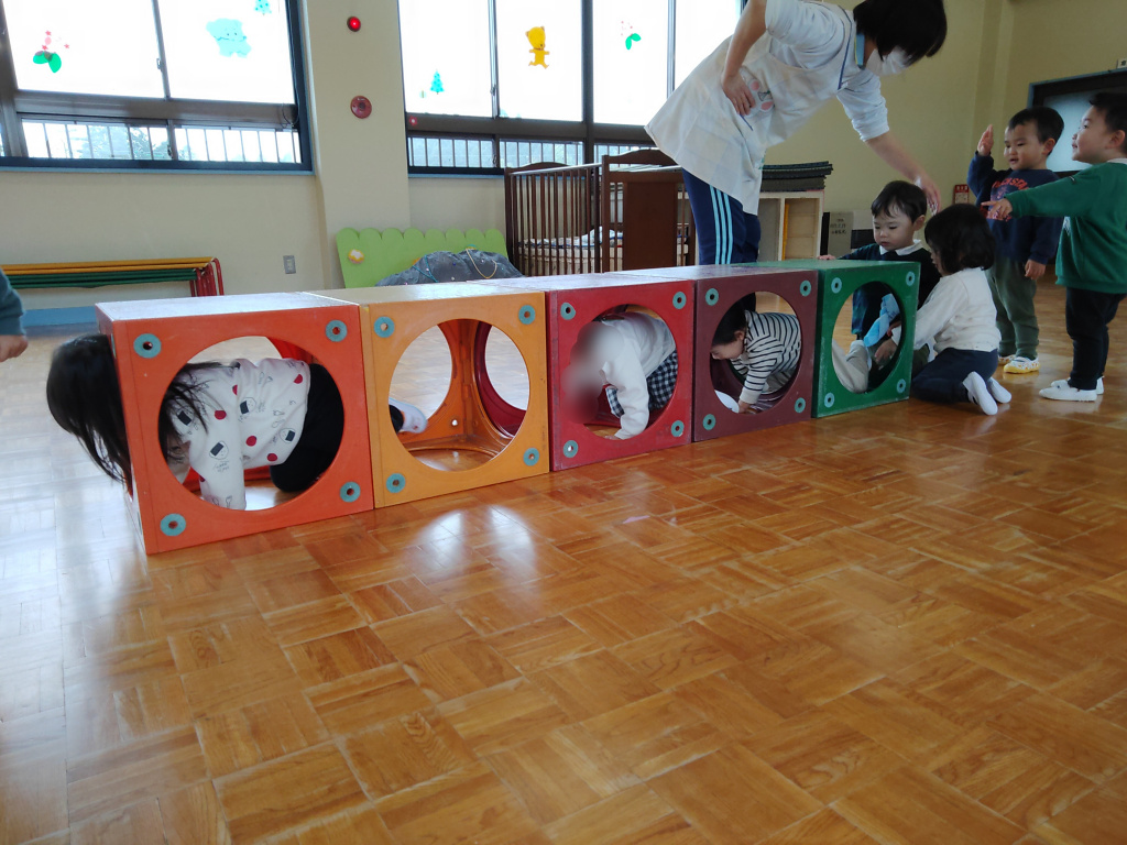 まずはカラーボックスのトンネルに挑戦。ハイハイの体勢になり、どんどん進んで行きます。