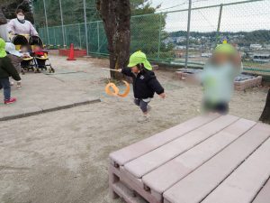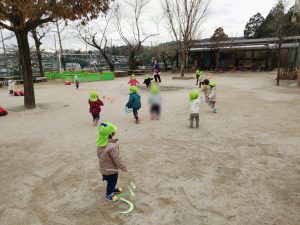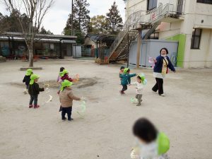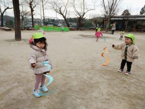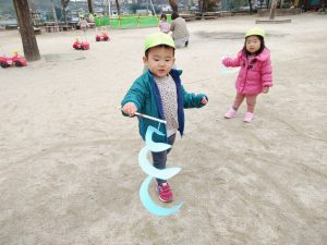 園庭に出るとさっそく手に持ち。走ったり腕を振って凧が揺れる様子を楽しんでいました。