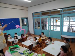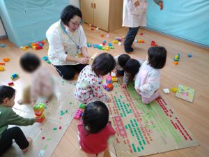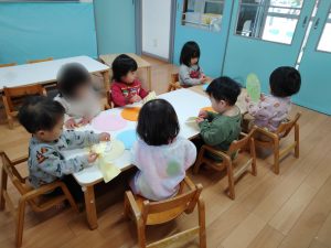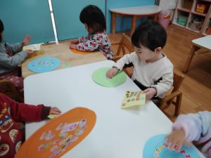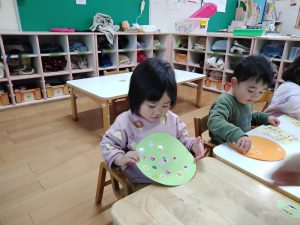 「せんせい、みてー!」うずまきの線の上に並べて貼ったり、シールの絵柄を見ながら「こいのぼりー!」「つばめー!」とひとつづつ声に出して言いながら貼ったりしていましたよ。どの子も指先がとっても器用になってきており、成長を感じた瞬間でした。