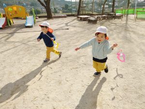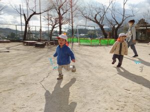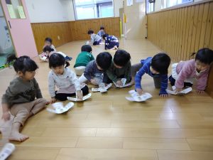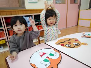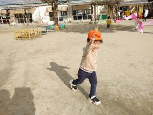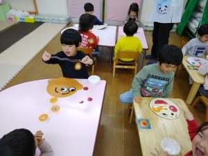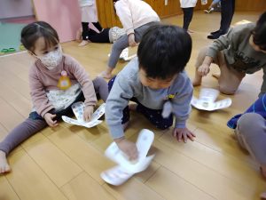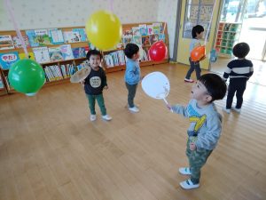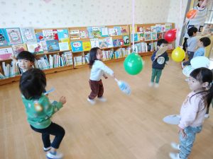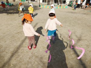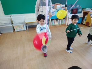 「それっ!」と元気いっぱい楽しみました。「〇〇くんいくよ!」と声をかけてから遊ぶ姿もあり友だちと仲良く遊べるようになってきました。
