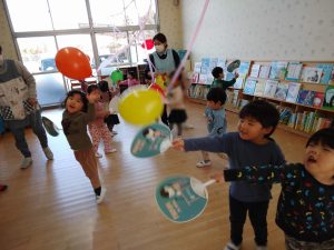 風船の羽根つきです。二人ペアになってうちわで打ち合いっこしましたよ。