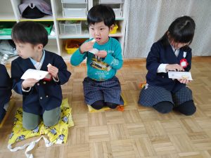 年長児の真似をして、「お菓子ちょうだい致します!」と皆で言った後に一礼し、お菓子をいただきました。