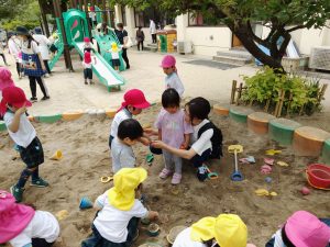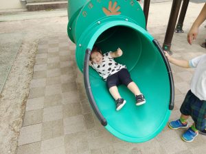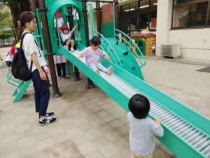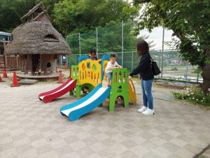 さぁ、次は園庭に出て遊具や砂場で遊びましたよ。保育園のお兄さんお姉さんも、優しく一緒に遊んでくれました!