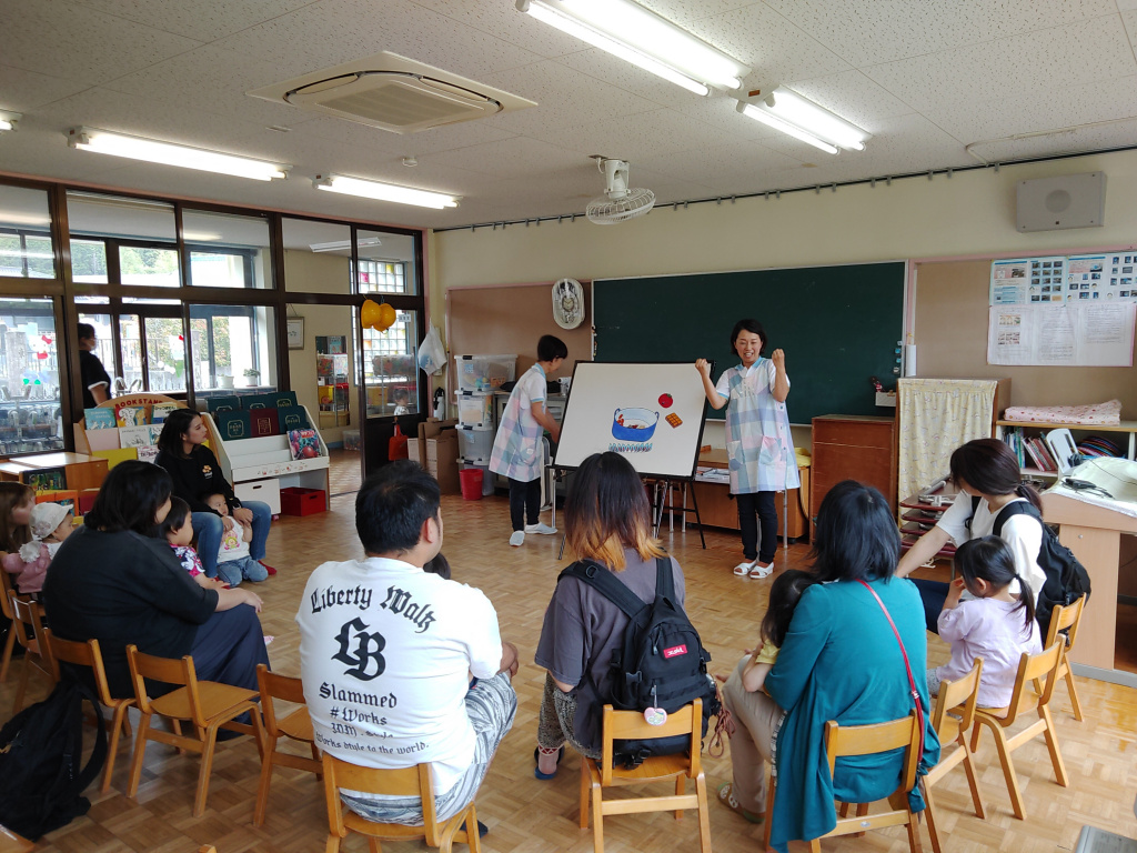 パネルシアターは、カレーライスとジャングルポッケです。歌と振りに合わせて興味津々!笑顔がとても嬉しかったです。