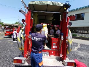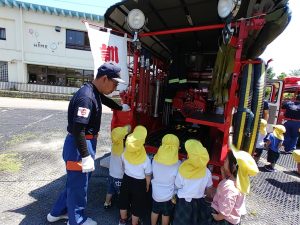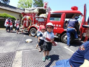子どもたちの質問にたくさん答えてくださったり、いろいろな体験をさせてもらったり、南姫消防団のみなさんありがとうございました。「もうお家に帰っちゃうの?」となんだか寂しそうにつぶやく子もいるぐらい、楽しい思い出になったようです。また消防車が保育園に遊びにきてくれるのが楽しみだね!