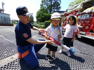 ヘルメットを被せてもらえたり、ホースも持たせてもらいまるで消防士さんみたい!