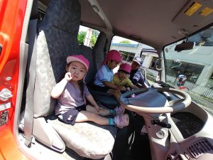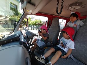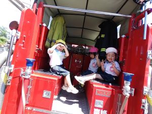 みんなで仲良く座ってみたよ!居心地が良くなったのか、なかなか降りようとしない子どもたちでしたよ!なかなか乗れない消防車に乗せてもらえて楽しかったね!