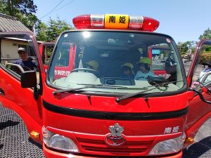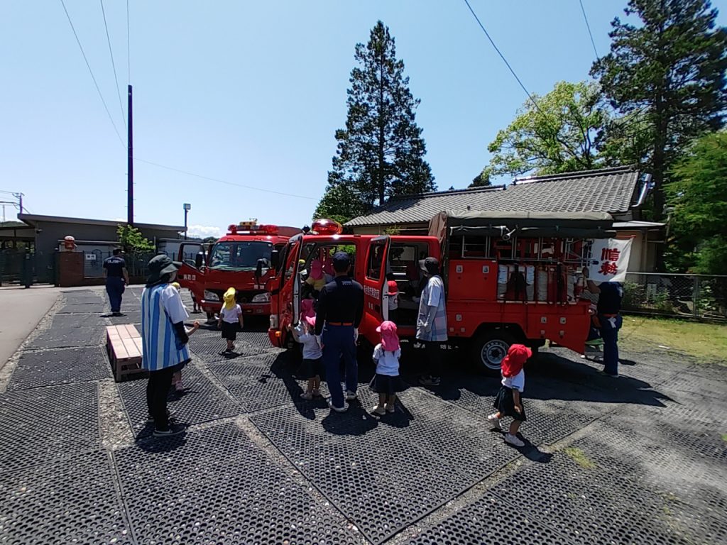 保育園に南姫消防団の消防車が遊びにきてくれました。チラッと消防車の姿が見えただけで子どもたちは「消防車きたー!」「やったー!」と大喜びで大興奮でしたよ。