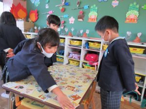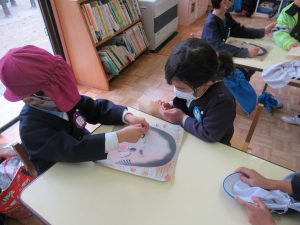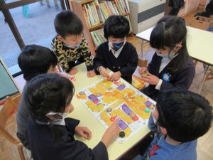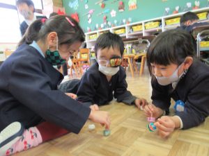 冬休み明け、「あけましておめでとう」と元気に新年の挨拶ができました。久しぶりに会った友達と色々なお正月遊びを楽しみましたよ。たくさんの友達と関わりながら、日本古来から伝わる伝承遊びを楽しむことができました。