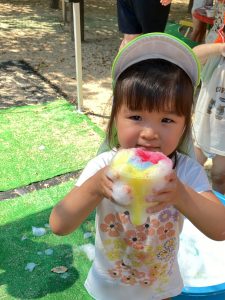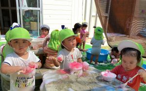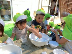 「〇〇ちゃーん!きてー!」などお友だちを誘って遊ぶ姿が見られるようになってきました。いろんな遊びに興味を持ち夢中で楽しむ子どもたち。もう少し涼しくなってきたら体を動かす遊びも楽しんでいきたいです!
