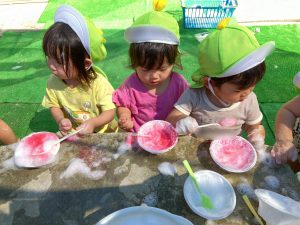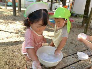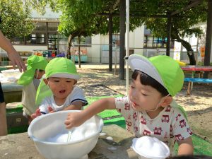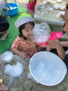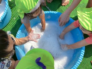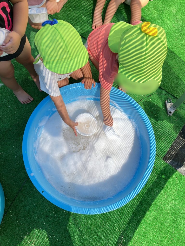 8月のプール遊びを終えたつくし組では、ひんやりふわふわな泡遊びを楽しみました!