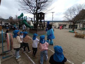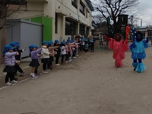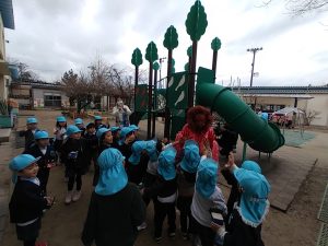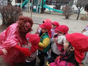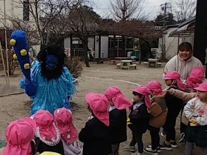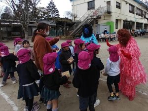 豆まきの後は可愛い鬼さんと仲良しに…。みんなの心の中の鬼さんも対峙できたかな?