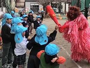 ちょっぴり怖い気持ちもあるけれど、勇気を出して「鬼は外〜!」と頑張って豆を投げようとする心の成長も感じられた豆まきでした。