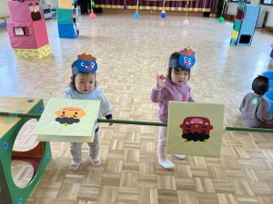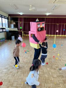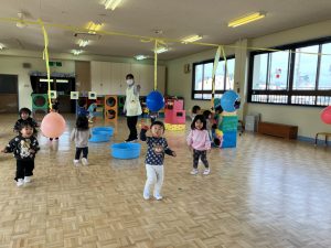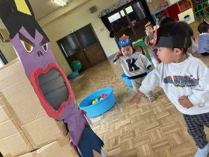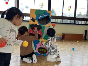 未満児はホールで鬼の口にボールを入れたり風船鬼に投げたりして楽しみましたよ!
