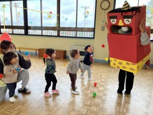 年中、年長組になると怖がりながらも果敢に鬼に向かって豆を投げる姿がみられましたよ!