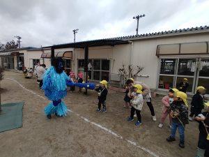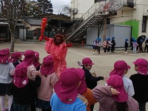 目の前に鬼が現れると硬直状態!「豆を投げてー!」と担任が声をかけます。