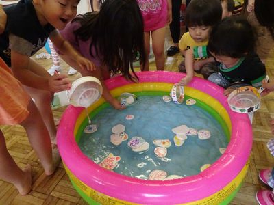 ビニールプールの中には、子ども達の作った魚がいっぱい!どの子も夢中になってすくいます。「見てー!こんなにとれた!」と山積みになった魚を見せてくれる子も!途中で遊びに来た ちゅうりっぷ組の小さなお友達には、「こうやってやるんだよ」「上手上手!」など優しく声をかけるお兄さん・お姉さんらしい一面も見られました。