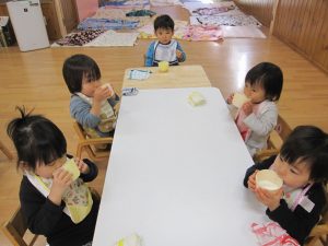今日の給食はパン!どの子も美味しそうに食べ始めます。