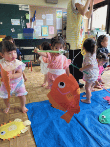 魚つりコーナーは未満児や未就園のお友達のお楽しみ!魚が釣れると「見てー!」と元気な声が響き渡りました。