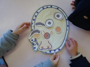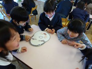 福笑いでは、「見えないからドキドキするー!」と手探りで形を確かめながら顔のパーツを置いていきます。