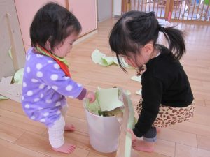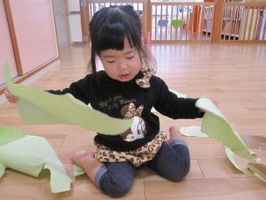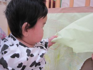 “ ビリビリ ”の音と紙の感触を楽しむ子ども達を見ながら