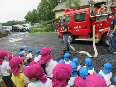 消防団の方が実際に丸めたホースをサッと広げ、レバーに連結をし「放水はじめ!」と放水する形を見せて下さいました。あまりの素早い動きに「マジックみたい!」との声が…「水はどこから出るの?」「このレバーは何?」などの質問にとても丁寧に答えて下さり年長組の子ども達は真剣に耳を傾けていました。