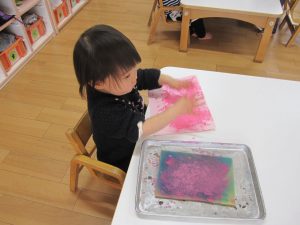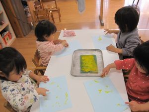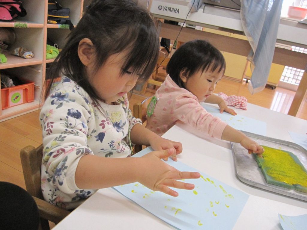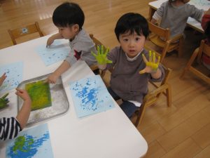 以前は不安そうに絵の具を手につけていた子も今では絵の具の感触を