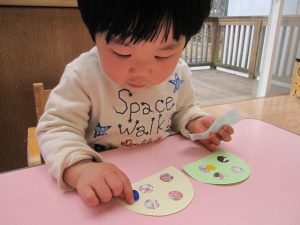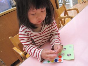 丸のシールを貼って模様づけ!“ここに貼ろうかな~”