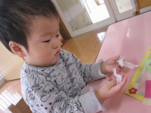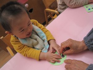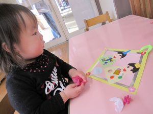 目のシールは少し小さいので保育士が様子を見ながら一緒に貼りました。