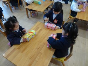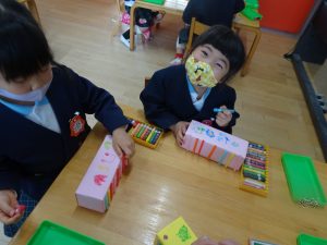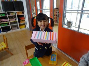 両面テープを剥がして間隔をあけて貼っていくんだよ、と声を掛けるとどの子も考えながら貼っていましたよ。