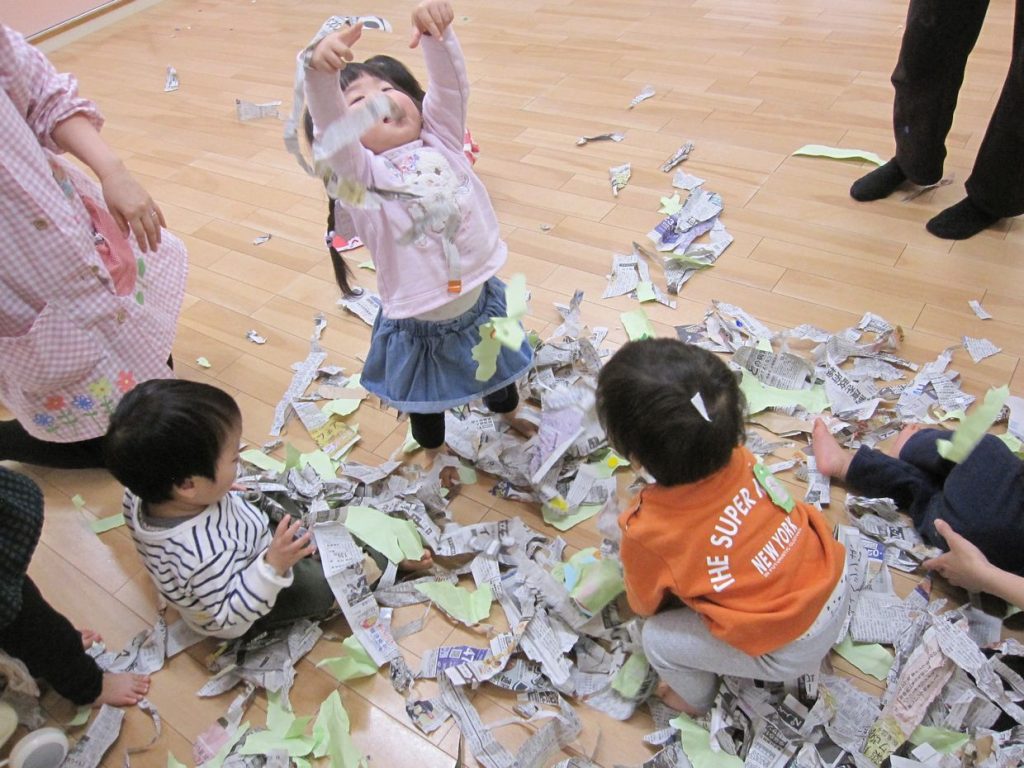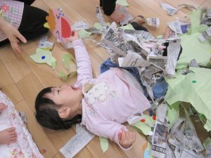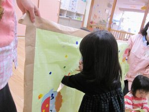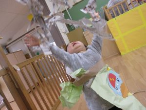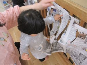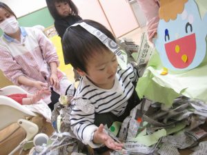 新聞紙と節分で行った豆まき(シール貼り)の台紙を使って遊びましたよ。
