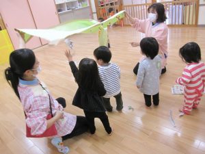 保育士が天井に向かってふわりと投げる姿を真似っこした