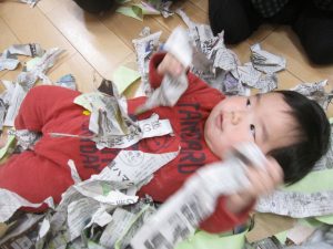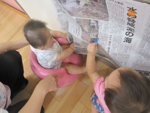 7月と同じ物を使って新聞遊びを始めましたが8カ月前には見られなかった