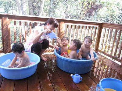 ◎年長、年中、年少、ちゅうりっぷ組は、暑い日にはシャワーを浴びて汗を流します。