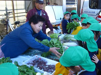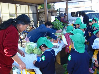 収穫の秋を迎え、年長さんが青空市場へ地元野菜のお買物に出掛けました。