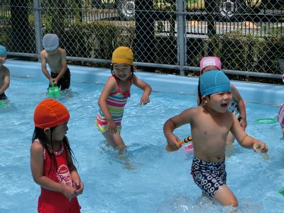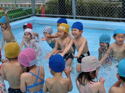元気に水しぶきを上げながらはしゃぐ子、まだ少し水に慣れていない子。