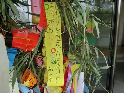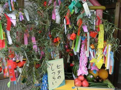 みんなの願い事を書いた短冊を付けた大きな笹飾りの下には七夕のしつらいとしての野菜や果物。