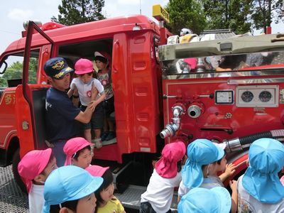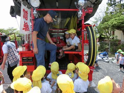 消防車に乗せてもらったり隅々まで見せてもらったり使い方を教えてもらったり・・・間近に見る消防車の迫力と憧れの車に乗れる喜びで興奮気味の子ども達でした。