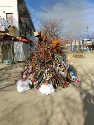 皆で持ち寄った注連縄や門松、習字、絵等を高く積み上げて点火。